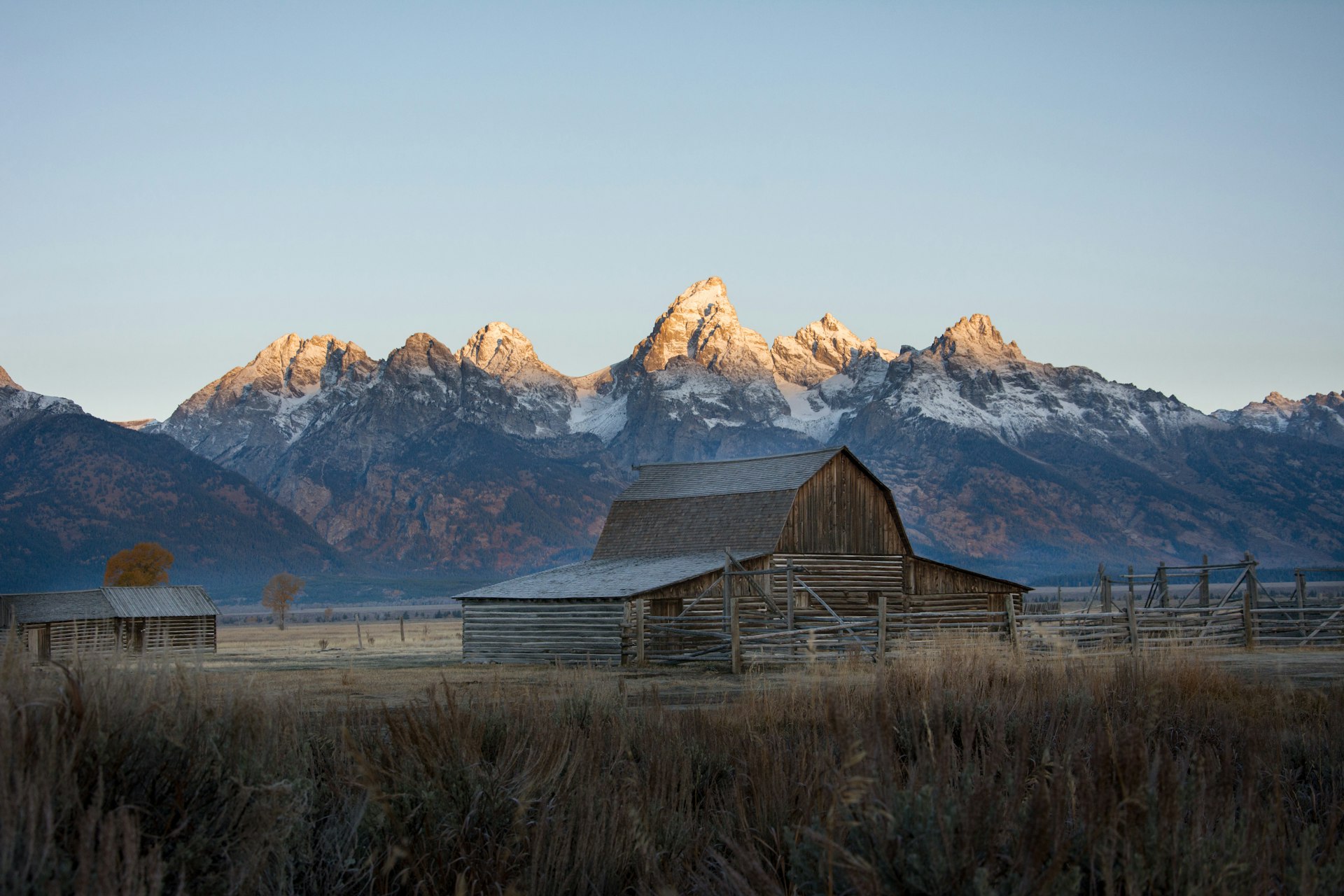 Historic barns from 1890s homesteaders frame the Tetons John Moulton’s barn is a photo icon. A flat, 1-mile stroll explores this rustic past sunrise glows golden here.