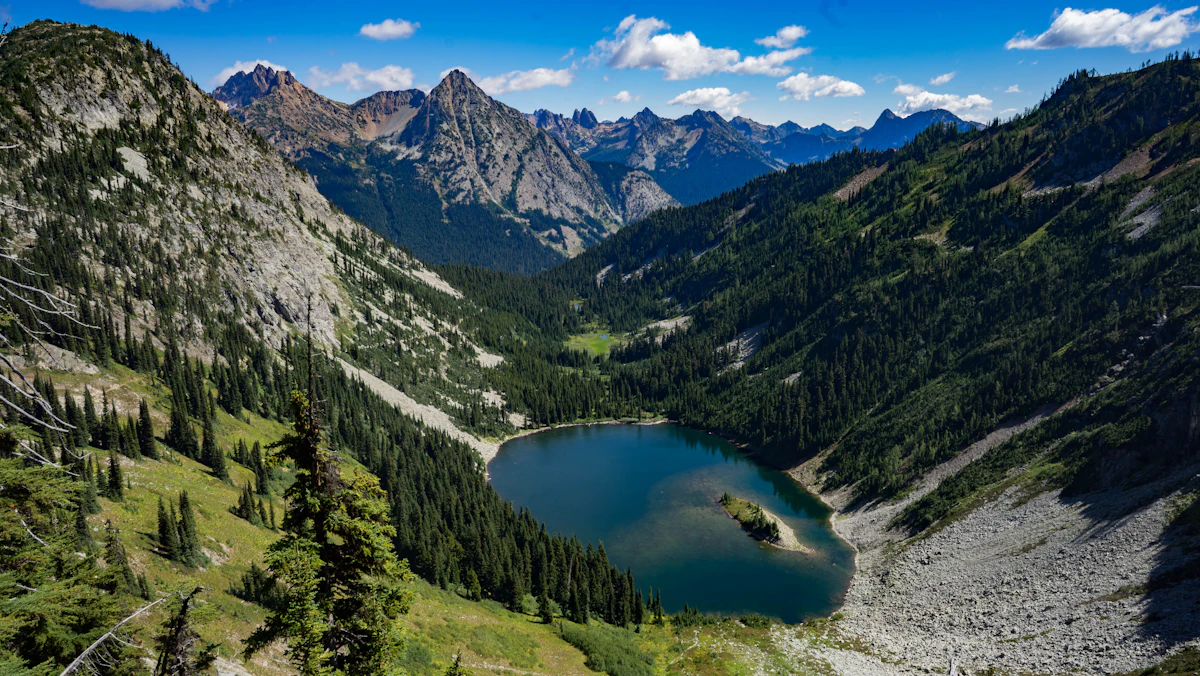 A 7.4-mile round-trip trail climbs 1,800 feet to a 5,400-foot saddle panoramas of glaciers, peaks. Moderate July-October bear country start early from Marblemount.